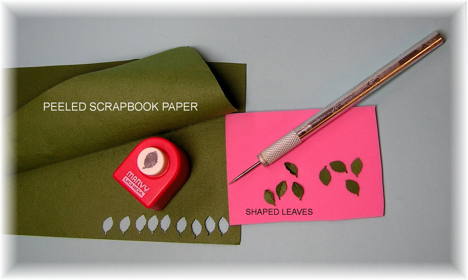 The leaves are tiny hearts punched from solid core, leaf green, lightweight paper. The punch used is Fiskar’s 3-in-one heart corner punch…I like using this punch because you get multiple heats with one punch and it has a nice variety of sizes. Lay a bundle of punched hearts on a piece of white Fun Foam. Use a pointed stylus to “draw” a line across the heart from the point. This will give shape to the leaves.