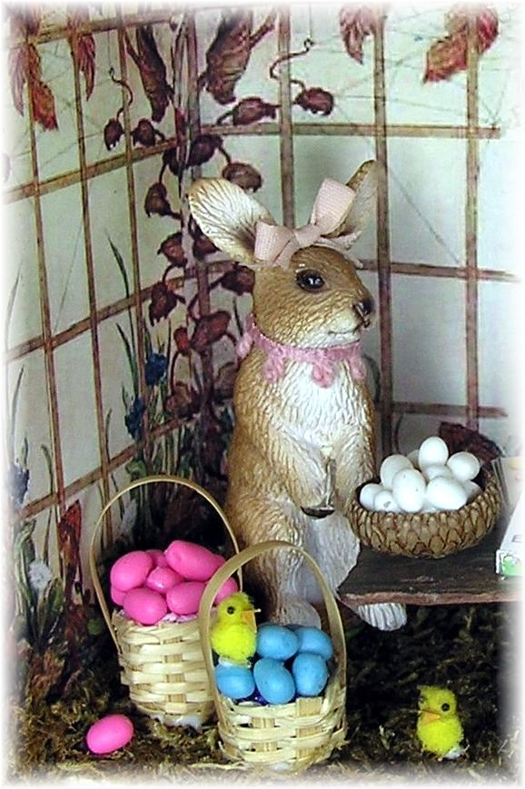 Baskets of dyed eggs sit on the ground and a few chicks (see the instructions in the first shelf instructions) have